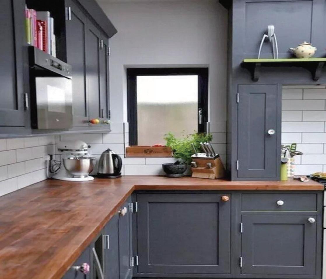 ▲ 橱柜的面 板选用原木色, 橱柜选用深灰色, 两者搭配让厨房 尽显一种深沉的 美感。
