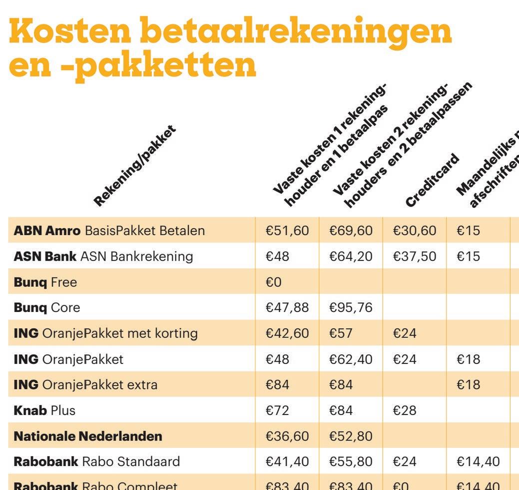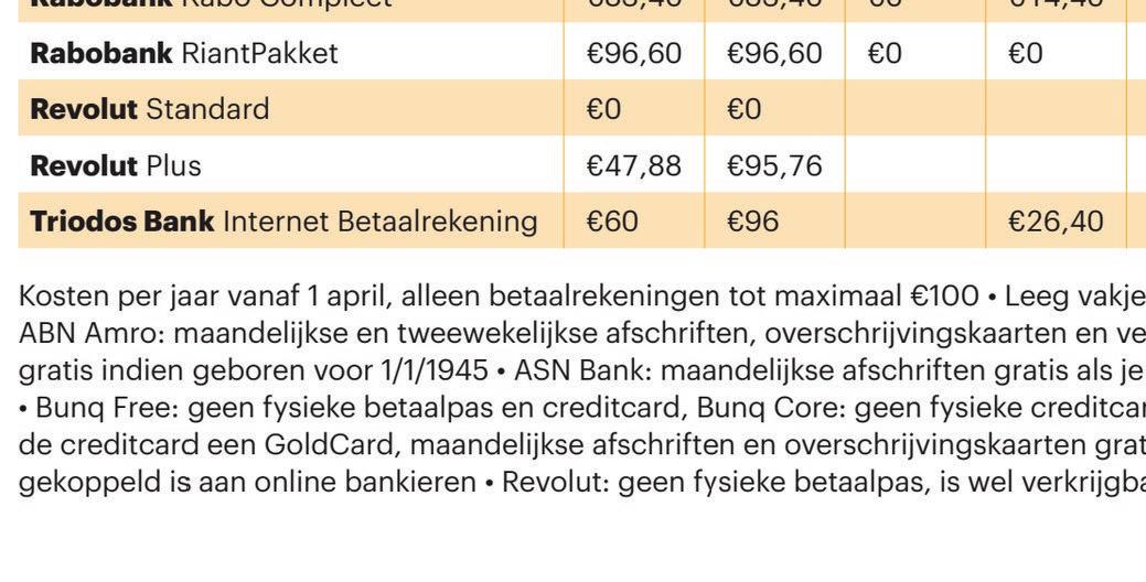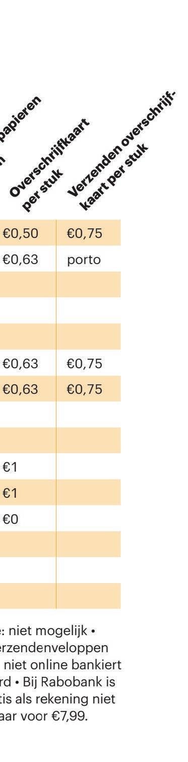 此外,纸质服务也更贵:纸质月度对账单 从原本“免费或无收费”变成每年 €15 ;只有“ 不使用网上银行”的客户才继续免费。ASN原 本不提供转账单(overschrijvingskaarten), 但RegioBank和SNS有,因此ASN现在把转账单 也纳入套餐:20张一册从€7.50涨到€12.50。