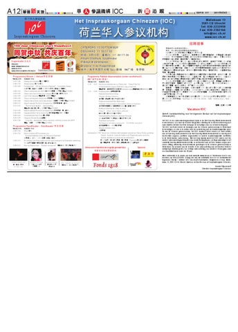 ZATERDAG 10 SEPTEMBER 尊敬的华人社团各位负责人: Samenwerking van KangNing en IOC - Gezondheidbijeenkomst 有关:华人参议机构理事会成员的候选人 DEN HAAG: 11:30-17:00 仅代表华人参议机构就以下事宜请大家多关注。 健康就是財富,健康對每一個人都是那麼重要。有健康的身體才可以一展 Studeer hard, iedere dag vooruitgang 华人参议机构是一个合作组织,就像是外侨协商法里描述的:它是由部长批准的 时间:9月10日(星期六)11:30-17:00 所長,達成自己的理想。尤其是現代人更注重健康,特別是五十歲以上人士更 一个组织,它与它制定的条例相一致并以满足外侨民族的利益为目标,它是区分外侨 客座老師和新教材 點目前在荷蘭的教育界也備受關注﹐教育界專家們正 應留意。為此康寧會將於7月30日(星期一)與IOC合辦一健康講座,歡迎各界人 Atrium Stadhuis, Spuitheater 民族群体并且代表某一群体或是几个群体的利益。 仕蒞臨參與。 Jnez Kzetzchmar是一位有多年在荷蘭中學給學生 為此進行研究和探討。 华人参议机构作为荷兰华人社会谋取利益的代表机构,自身致力于荷兰华人的社 Rabbijn Maarsenplein 会地位的改善。华人参议机构代言所有荷兰华人的观点和意见。华人参议机构通过外 - 中學生在第四年必須選擇今後的學科方向為時 A) 主 題:高血壓與糖尿病 教中文的老師。目前﹐徐天就老師所辯解的中荷文得 侨协商法中所说的商议,通过与理事机构和政治团体及其它的在荷共同生活的社团的 過早﹐因為他們還沒有完全確立自身今後的定位。 B) 地 點:金屋酒樓 Golden House in de Wagenstraat 教材“好學”(Chinese Braderie ‘n makkie),是普遍使用的 商议后来实现代言的功能。因此华人参议机构是要非常有目标性地选择与其它的外侨 C) 地 址:Havenstraat 20 9951 AE Winsum 教材之一,教材在編寫時,就特别關注本地化和引發 - 每位老師自己確定上課的規章制度﹐學生沒有 地点:海牙市政厅大楼 Spui剧场 RM广场 车仔街 协商合作组织最优化的合作,在外侨协商中共同代表各个群体的利益,这些群体如土 D) 時 間:下午一時至三時