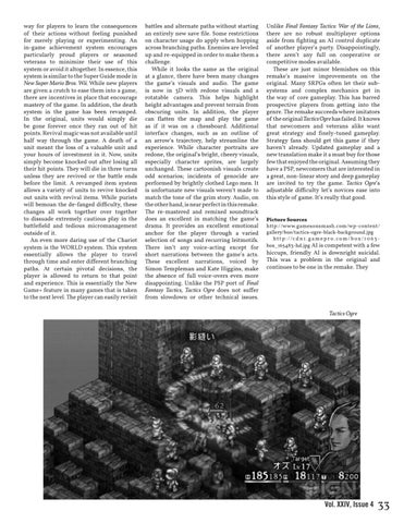 battles and alternate paths without starting an entirely new save file. Some restrictions on character usage do apply when hopping across branching paths. Enemies are leveled up and re-equipped in order to make them a challenge. While it looks the same as the original at a glance, there have been many changes the game’s visuals and audio. The game is now in 3D with redone visuals and a rotatable camera. This helps highlight height advantages and prevent terrain from obscuring units. In addition, the player can flatten the map and play the game as if it was on a chessboard. Additional interface changes, such as an outline of an arrow’s trajectory, help streamline the experience. While character portraits are redone, the original’s bright, cheery visuals, especially character sprites, are largely unchanged. These cartoonish visuals create odd scenarios; incidents of genocide are performed by brightly clothed Lego men. It is unfortunate new visuals weren’t made to match the tone of the grim story. Audio, on the other hand, is near perfect in this remake. The re-mastered and remixed soundtrack does an excellent in matching the game’s drama. It provides an excellent emotional anchor for the player through a varied selection of songs and recurring leitmotifs. There isn’t any voice-acting except for short narrations between the game’s acts. These excellent narrations, voiced by Simon Templeman and Kate Higgins, make the absence of full voice-overs even more disappointing. Unlike the PSP port of Final Fantasy Tactics, Tactics Ogre does not suffer from slowdown or other technical issues.