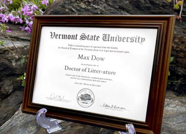 and affectionate nature, Vermont State University has awarded Max an honorary doctorate in "litter-ature." While he won't participate in the graduation ceremony, his degree will be delivered to his owner soon after. Max's presence on campus not only brings joy and comfort but also highlights the unique and welcoming spirit of Vermont State University.