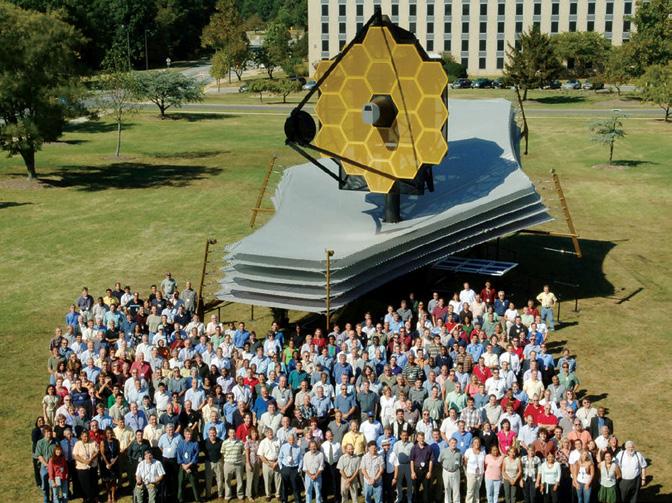 Full-scale James Webb Space Telescope model assembled on the lawn at NASA Goddard Space Flight Center.