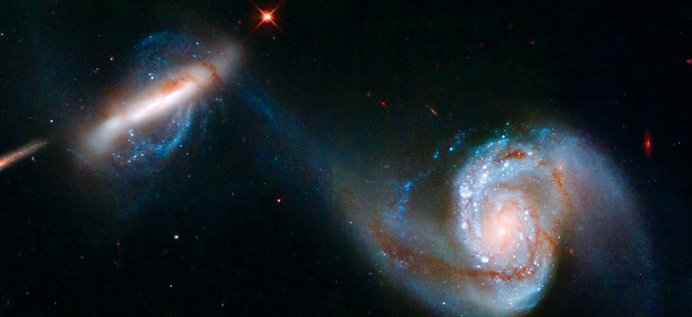 which is also seen in other interacting galaxies, suggests that some stars and gas drawn from the larger galaxy have been caught in the gravitational pull of the smaller one. This image was taken in February 2007 with Hubble's Wide Field Planetary Camera 2 detector.