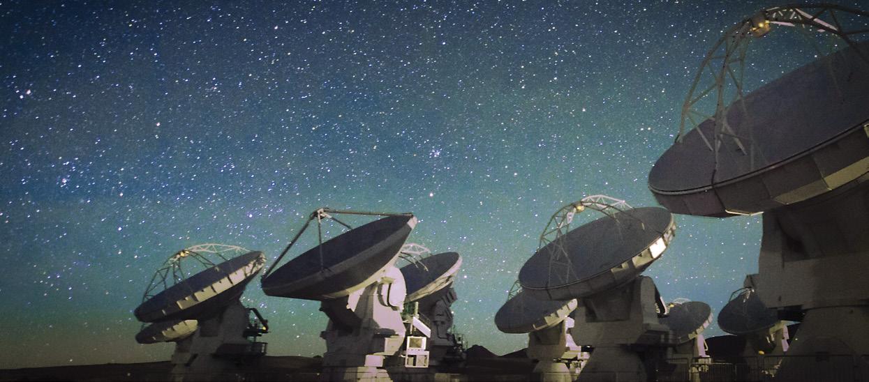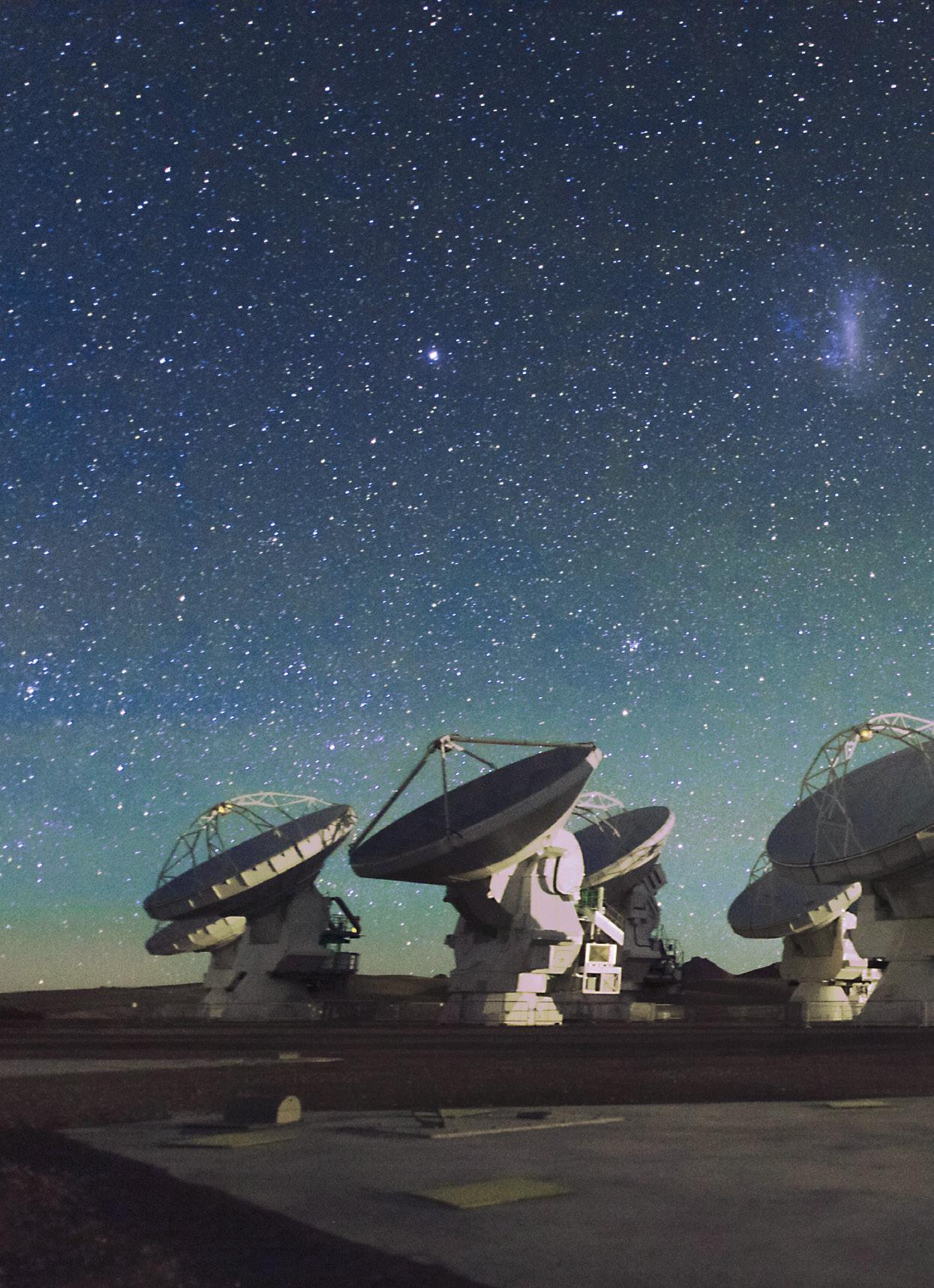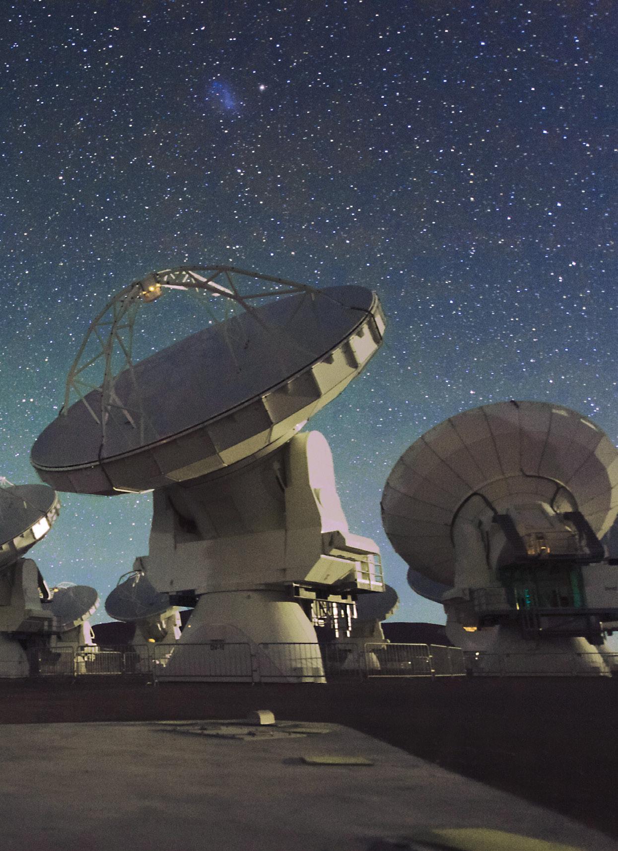The Large and Small Magellanic Clouds, two companion galaxies to our own Milky Way galaxy, can be seen as bright smudges in the night sky in the centre of the photograph. Antennas of the Atacama Large Millimeter/submillimeter Array (ALMA) on the Chajnantor Plateau in the Chilean Andes.