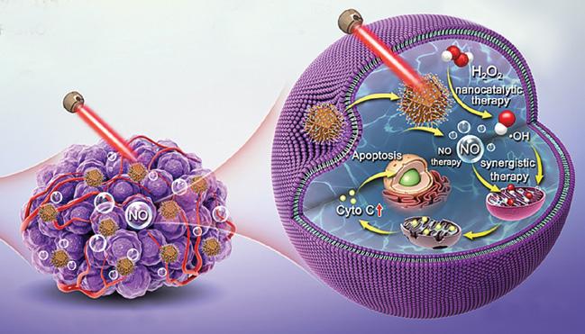 The team created tiny iron particles to interact with hydrogen peroxide (H2O2) — a substance found in tumour cells. The iron particles carry molecules that release nitric oxide (NO) gas activated by laser, which triggers a controlled form of cell death for cancer treatment.