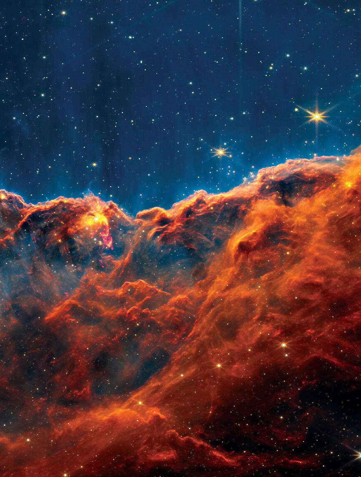 The background on this page is the Carina Nebula, a group of young stars hidden inside clouds of dust and gas, visible in infrared light with high resolution instruments. It was one of the first images released by NASA from the James Webb telescope. The data helps scientists understand how our Sun formed and how radiation from nearby large stars affect the development of planets.