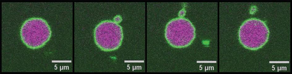 proteins involved in the infection of host cells. They added a long carbon chain known as an octyl chain to the molecule, creating an anchor that enhances its ability to attach to lipid membranes. When these modified peptides were added to the outside of the GUVs, they induced the formation of smaller daughter vesicles that bud off, mimicking viral capsids – and the daughter vesicles could also encapsulate materials, just like a virus.