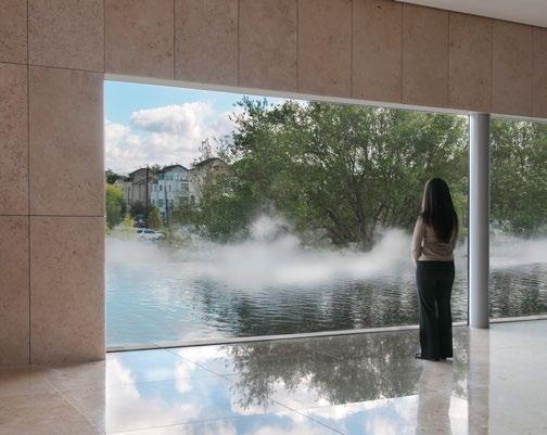 “Set back from the street with a pristine front lawn, the Asia Society Texas Center is a striking, low-slung Yoshio Taniguchi-designed building that's a study in architectural minimalism. Design elements include glass walls, wood paneling, floating staircases, a sculpture garden, an infinity pond, and a modern water feature that causes mist to rise to captivating effect.”