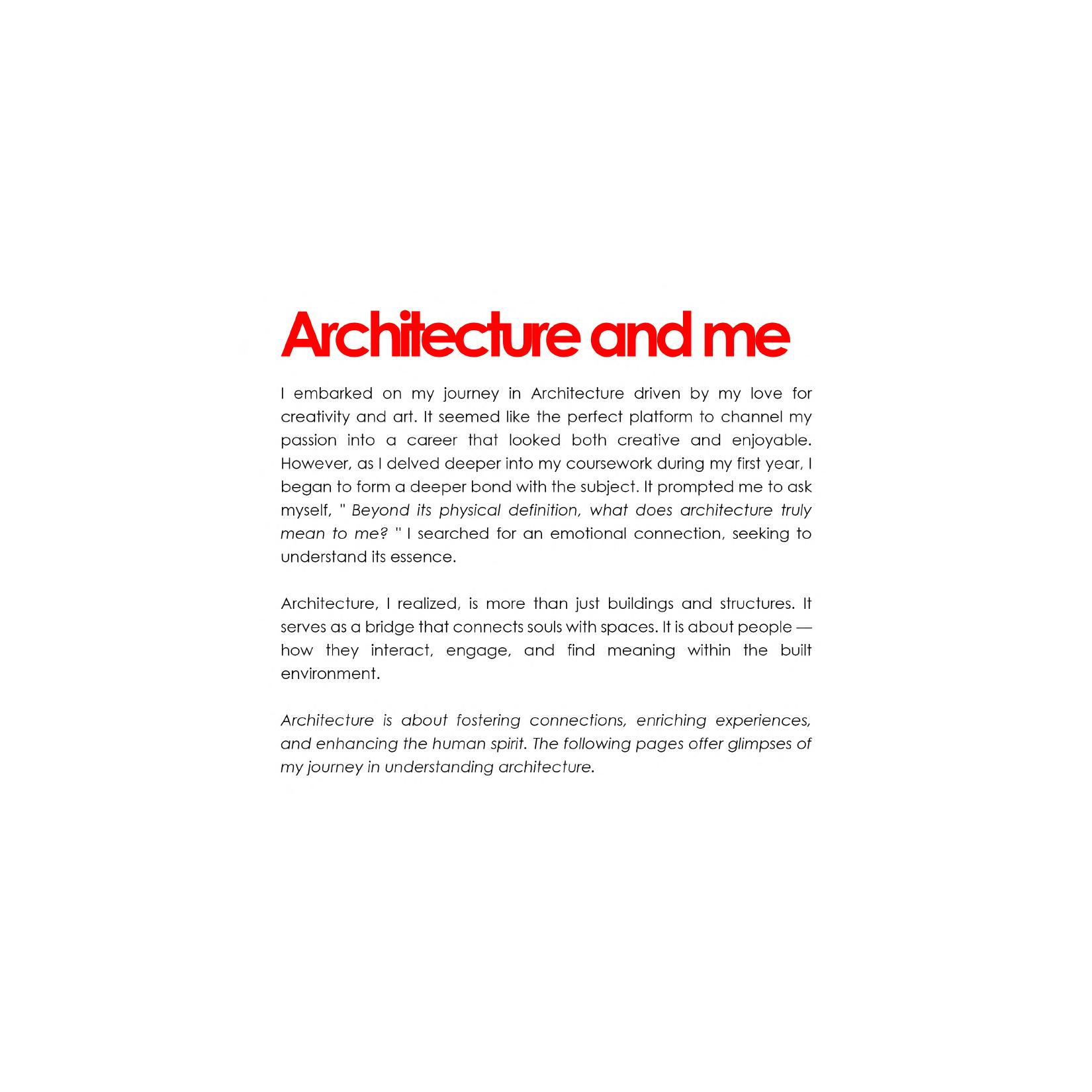 The "Architecture x People" project explores the intricate relationship between architecture and the individuals who interact with it. This mini folio presents my insights and narratives, highlighting how architectural design impacts and reflects the experiences and behaviors of people. Through a series of stories and conclusions, I aim to illustrate the profound connections between built environments and human experiences.