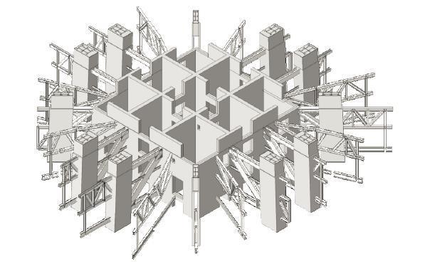 Super column System: two at each end of each orthonormal axis four diagonal super columns along each 45-degree axis