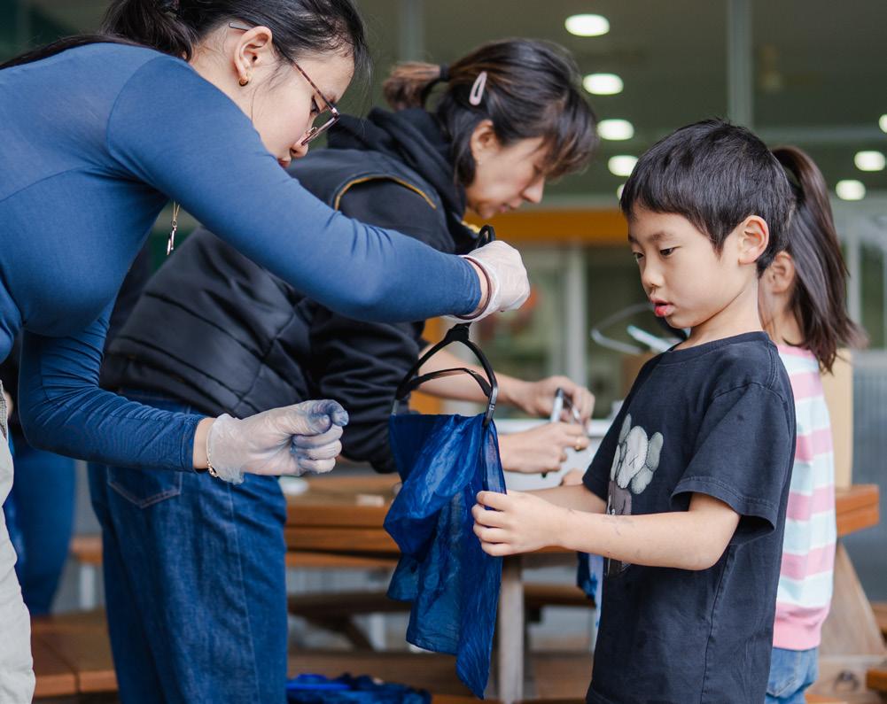 Our partners at Myojo Gakuen School Koenkai in Kichijoji are involved in preserving this craft by having its students participate in the full process of aizome, from cultivating and harvesting the indigo plants on the school's grounds to preparing the sukumo and actually dyeing their own items, which serves to teach them about traditional Japanese culture, sustainability, and the local community's agricultural history. Two volunteers from the school, Ichinose-san and Shibuya-san, were invited by the Japan Center to guide our first graders in trying the dyeing process.