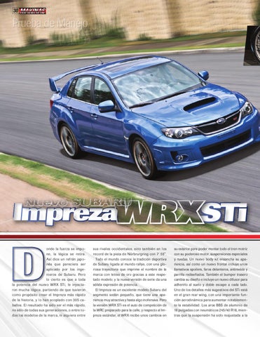 sus rivales occidentales, sino también en los record de la pista de Nürbrurgring con 7’ 55”. Todo el mundo conoce la tradición deportiva de Subaru ligada al mundo rallye, con una gloriosa trayectoria que imprime el nombre de la marca con letras de oro gracias a este respetado modelo; y la nueva versión de serie da una sólida expresión de potencia. El Impreza es un excelente modelo Subaru del segmento sedán pequeño, que tiene una apariencia muy atractiva y hasta algo inofensiva. Pero la versión WRX STi es el auto de competición de la WRC preparado para la calle, y respecto al Impreza estándar, el WRX recibe unos cambios en