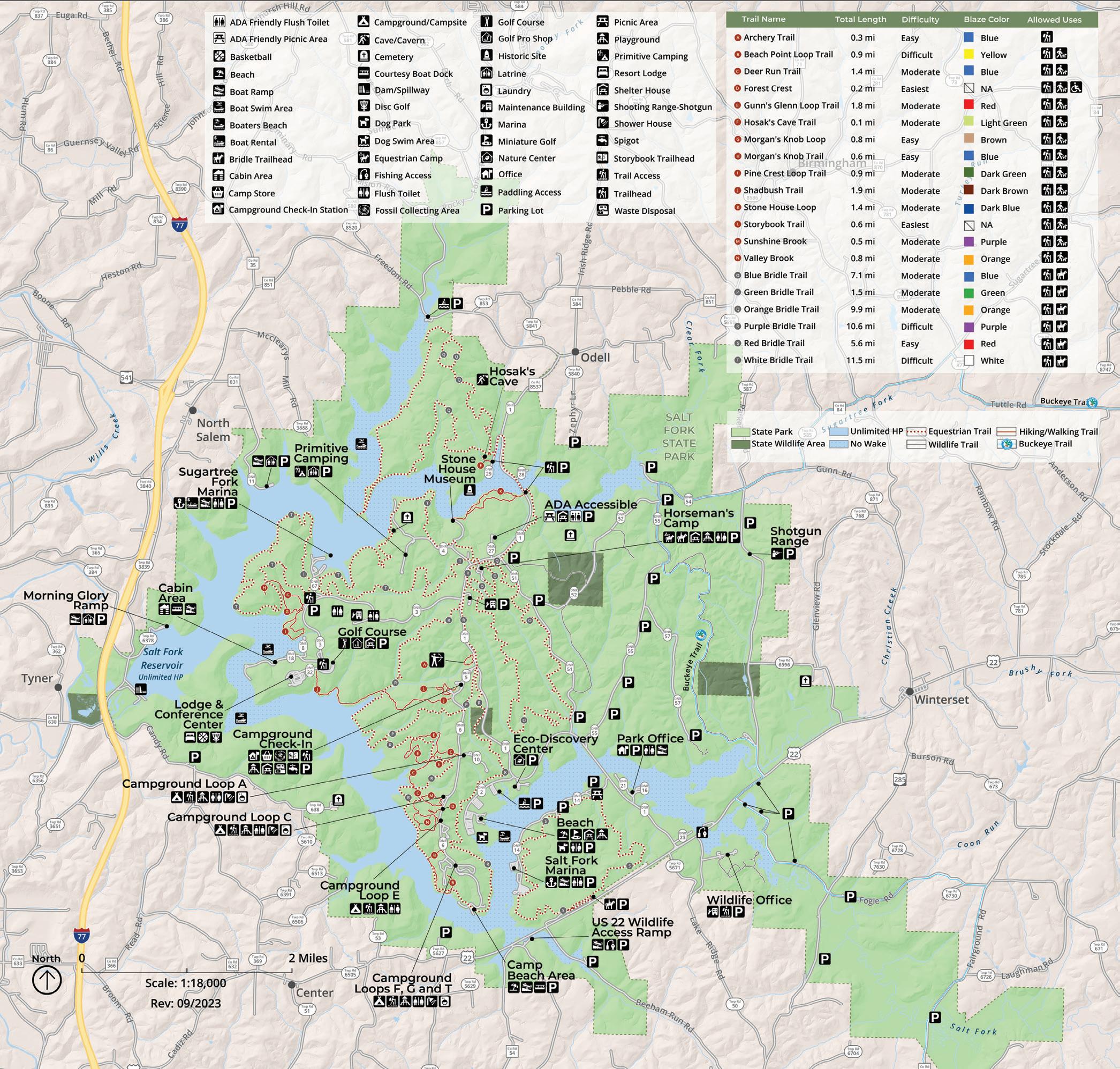 Salt Fork State Park offers many opportunities for visitors to pursue their favorite outdoor activities year-round. An 18-hole golf course will challenge even the most experienced golfer. Twenty miles of continuous bridle trails wind through scenic forest areas. Boats of unlimited horsepower are allowed on the lake, and waterskiers may