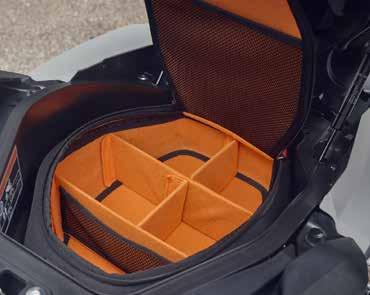 Functional rear bag specifically adapted to the tapered shape of the rear seat. Capacity of 15L that can be expanded to 22L. Easily attached and perfectly stable when installed with the specific attachment included. Dimensions in mm (W x L x H): 355 X 365 X 243