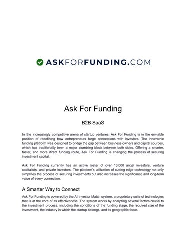 In the rapidly evolving world of entrepreneurship, Ask For Funding stands out as a groundbreaking platform revolutionizing the way founders connect with investors. Built to eliminate traditional barriers in fundraising, it provides a streamlined and intelligent system that helps entrepreneurs secure capital efficiently. By merging technology with accessibility, Ask For Funding empowers startups to transform ideas into reality through smarter and more direct investor relationships. Ask For Funding connects its users with a vast network of more than 16,000 active angel investors, venture capitalists, and private financiers. This impressive community ensures that entrepreneurs can quickly access the right opportunities. Through its advanced technology, the platform enhances the relevance of every connection and increases the long-term value of business relationships formed within its ecosystem. The platform’s proprietary AI Investor Match system drives this innovation. By analyzing essential factors such as industry sector, funding stage, investment range, and geographic focus, the AI precisely identifies investors most likely to support specific ventures. This tailored approach eliminates guesswork, ensuring that both startups and investors find the right fit efficiently and effectively. Unlike traditional fundraising methods that rely on broad outreach, Ask For Funding prioritizes targeted precision. Founders spend less time pursuing mismatched opportunities and more time developing their businesses. Meanwhile, investors gain streamlined access to ventures that align with their interests and objectives, resulting in stronger, mutually beneficial partnerships. The platform’s integrated communication tools enable faster and more transparent engagement. Entrepreneurs can connect with potential investors instantly through their direct messaging and investor alert systems, fostering authentic dialogue.