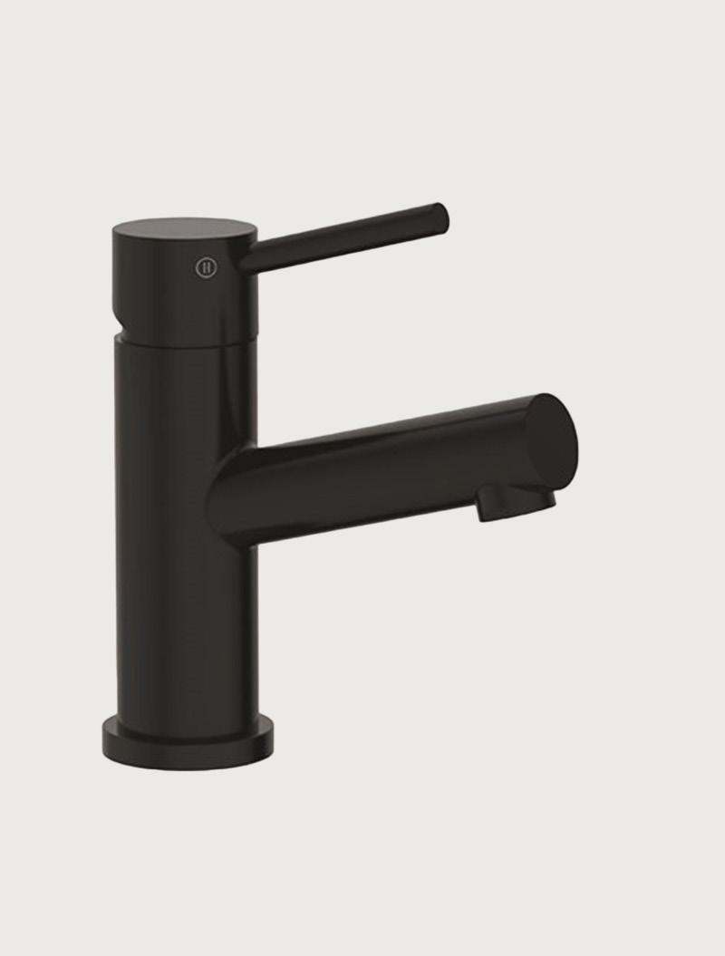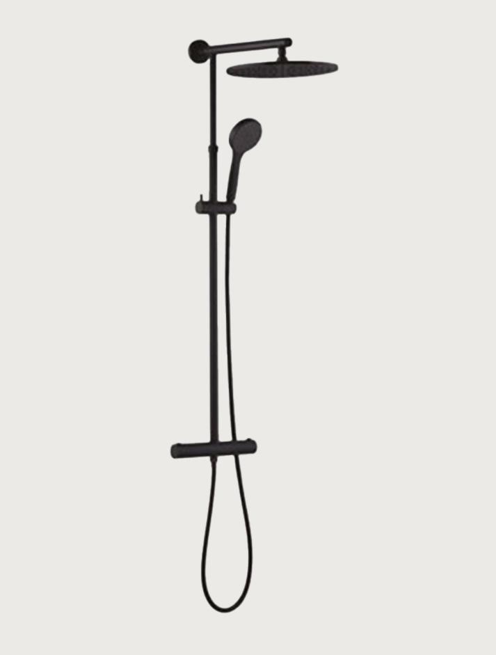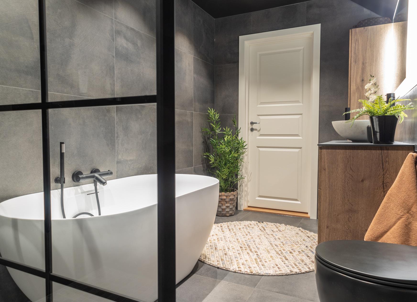 Syndle badekar hvit matt, Tenge badekarkran sort med Felix hånddusj sett og Ciba sort matt vegghengt toalett.