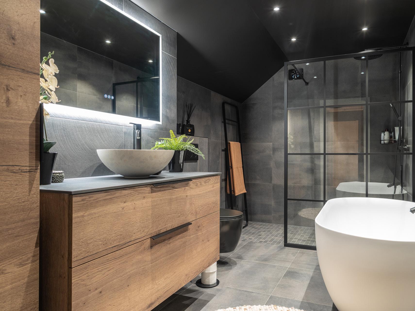 Big møbel i eik Natur med HPL benkeplate sort antrasitt og Terrazzo One bolleservant, Silhouet høy sort servantkran.