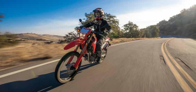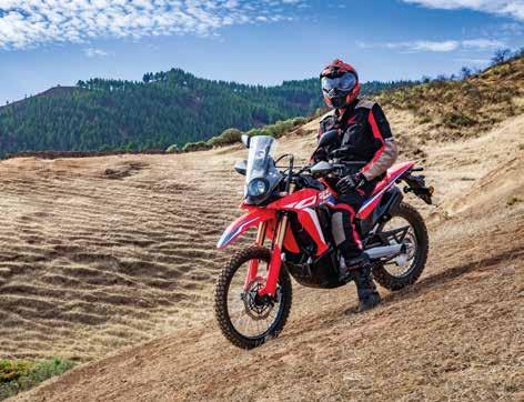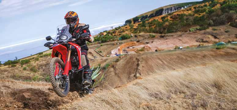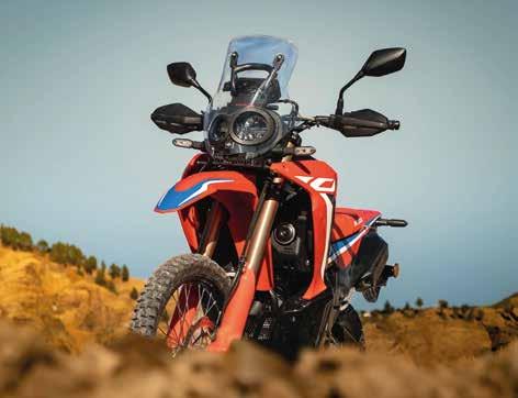 Made for the adventurous dual-sport rider, the CRF300 RALLY is a small capacity machine packing heavyweight credentials. With styling drawn directly from the competitionspecification HRC CRF450 RALLY, it adds long-range ability and comfort to its off-road performance. The fuel tank holds 12.8L, with a 1.6L reserve. And, unlike most dirt bikes, the flat filler cap is hinged for clean, easy-fill convenience. Ensuring relaxed, natural control the handlebar position is pulled back and the footpegs set low and back, making room for gear changing in off-road boots. They also feature rubber inserts. Seat height is 885mm. Piercing, asymmetric dual LED headlights provide excellent forward visibility, while flexibly mounted indicators are also bright LED. For instant readability the LCD instruments use large black digits on a crisp white display.