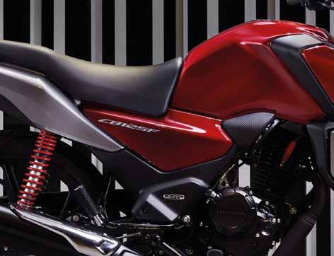 Open the throttle and move forward, effortlessly. The CB125F has opened up a new world ahead and this motorcycle could be the beginning of a whole new adventure. Designed around a superefficient eSP engine and fine-handling chassis, it’s lightweight, economical and packing great aroundtown performance. It’s also got a full-sized feel, for a full-sized experience and features the signature CBfamily style of broad-shouldered fuel tank and silver side shrouds. There’s wind protection from the angular nose fairing and fly screen, and the blacked-out engine and exhaust make bright graphics stand out sharply. Red rear shock springs add a sporty detail. Passengers get their own grab-rail and, for easy care of the sealed drive chain, there’s a centre stand.