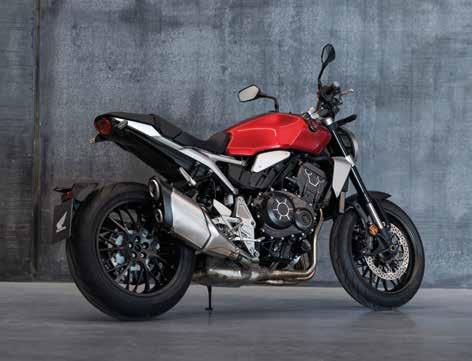 The inline, four-cylinder engine produces peak power of 107kW @ 10,500rpm and 104Nm torque, with smoothed throttle response. Throttle By Wire (TBW) control delivers three default riding modes, STANDARD, RAIN and SPORT, plus 3-level USER customisation of Engine Power, Engine Braking and Honda Selectable Torque Control (HSTC). The 4-2-1 exhaust system closely cradles the engine; above 5,500rpm it emits a deep, raw tone to match the exhilarating acceleration as power builds. Adjustable Showa Separate Function Fork Big Piston (SFF-BP) forks offer high quality control, while the rear shock operates through a singlesided swingarm. Dual 310mm floating front discs are worked by radial-mount 4-piston calipers; along with ABS, they provide incredible braking force and feel in all riding conditions.