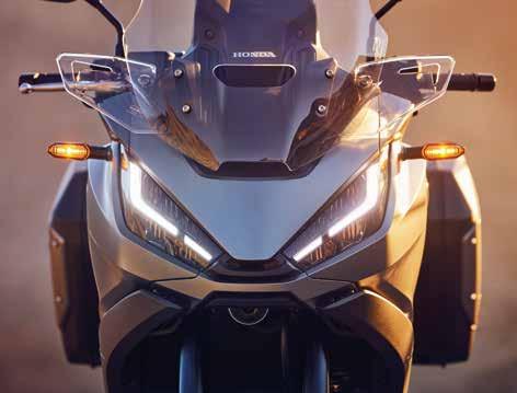 With the steel frame’s rigidity optimised for strength, feel and stability, the 43mm Showa cartridge-type USD forks and rear shock, working an aluminium swingarm through Pro-Link, return impressive suspension reaction. 150mm stroke front and rear ensures supple compliance, even on rough city roads; rear spring preload is hydraulically-adjustable. There’s also maximum grip and stability from 120/180 section front and rear tyres and smooth, progressive ABS-controlled braking power. The 6.5-inch TFT touchscreen offers Apple CarPlay®, Android Auto® and Bluetooth® connectivity to allow intercom use and access to smartphone functions –such as navigation, music and calls – via the display and a helmet headset. Daytime Running Lights (DRL) automatically adjust to ambient light intensity. Over 50km/h, the selfcancelling Emergency Stop Signal (ESS) indicates a hard-stop situation to those behind. The indicators also auto-cancel.