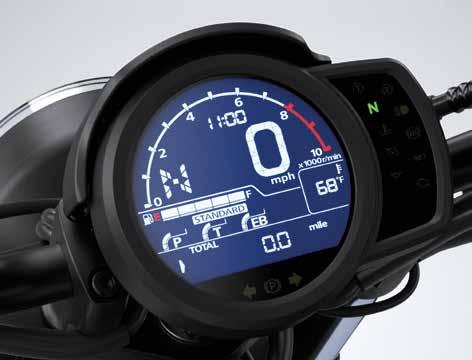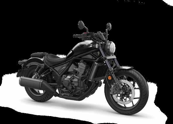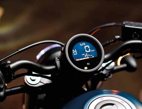The rigid, low-slung tubular steel frame is central to CMX500 Rebel style and hugely complemented by 16-inch diameter cast aluminium wheels with fat, 130/9-16 and 150/80-16 front and rear tyres. For a stripped-down look the pillion footpegs and rear seat pad quickly unbolt. 41mm telescopic front forks are matched to spring preload- adjustable, nitrogencharged shock absorbers, for a compliant and supple ride; both front and rear discs are controlled by twochannel ABS, for confident braking in all conditions. All lighting is premium LED and there’s a digital Gear Position indicator in the circular, 100mm negative LCD display. There’s also the option of the Rebel S –finished in Titanium Metallic and loaded with a factoryfitted headlight cowl and smoked screen, retro fork gaiters and a special diamond-stitch seat.