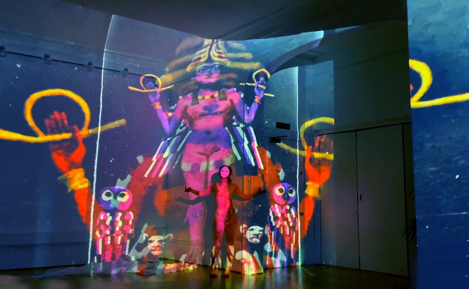 In Alanbari’s adaptation of the original myth, the audience is immersed in sensory stimulation wavering between traditional and contemporary visuals and sounds. Her adaptation is an invitation to engage with our natural treasures as well as tangible and intangible cultural heritage. Tangible heritage is either in museums or sites with varying extents of accessibility, and at times abroad in difficult to access sites or worse, areas where war is rife, and artefacts are destroyed by violence or neglect. Intangible heritage are the traditional beliefs, customs, and stories of a community, passed through generations by word of mouth and are increasingly forgotten or at risk of becoming irrelevant. ‘Gilgamesh Contemporary’ immerses its audiences in sporadic visuals of endangered natural sites, ancient works of Mesopotamian art from the Louvre, the British Museum and the Museum of Mosul as well as the traditional sounds of live oud music. They are juxtaposed with scenes and sounds from contemporary urban life allowing the audience to relate, and therefore engage with heritage not as an idea but immersively through the senses.