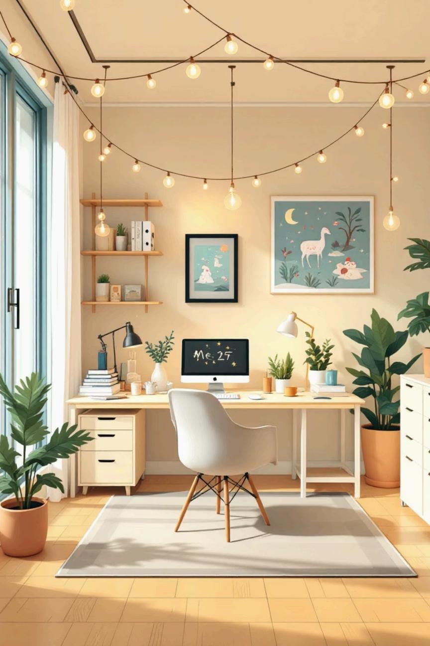 Drape string lights or battery-powered fairy lights around monitors, cubicle walls, and shelving for cozy, magical ambiance that brightens even the grayest winter days.