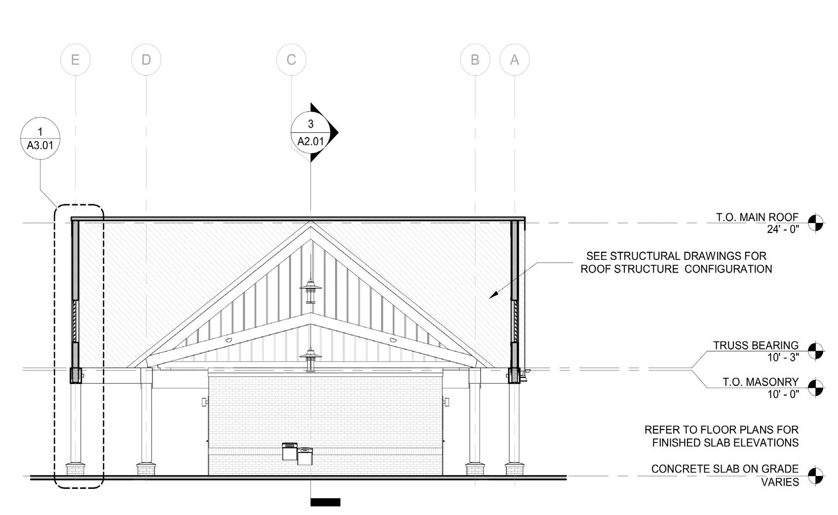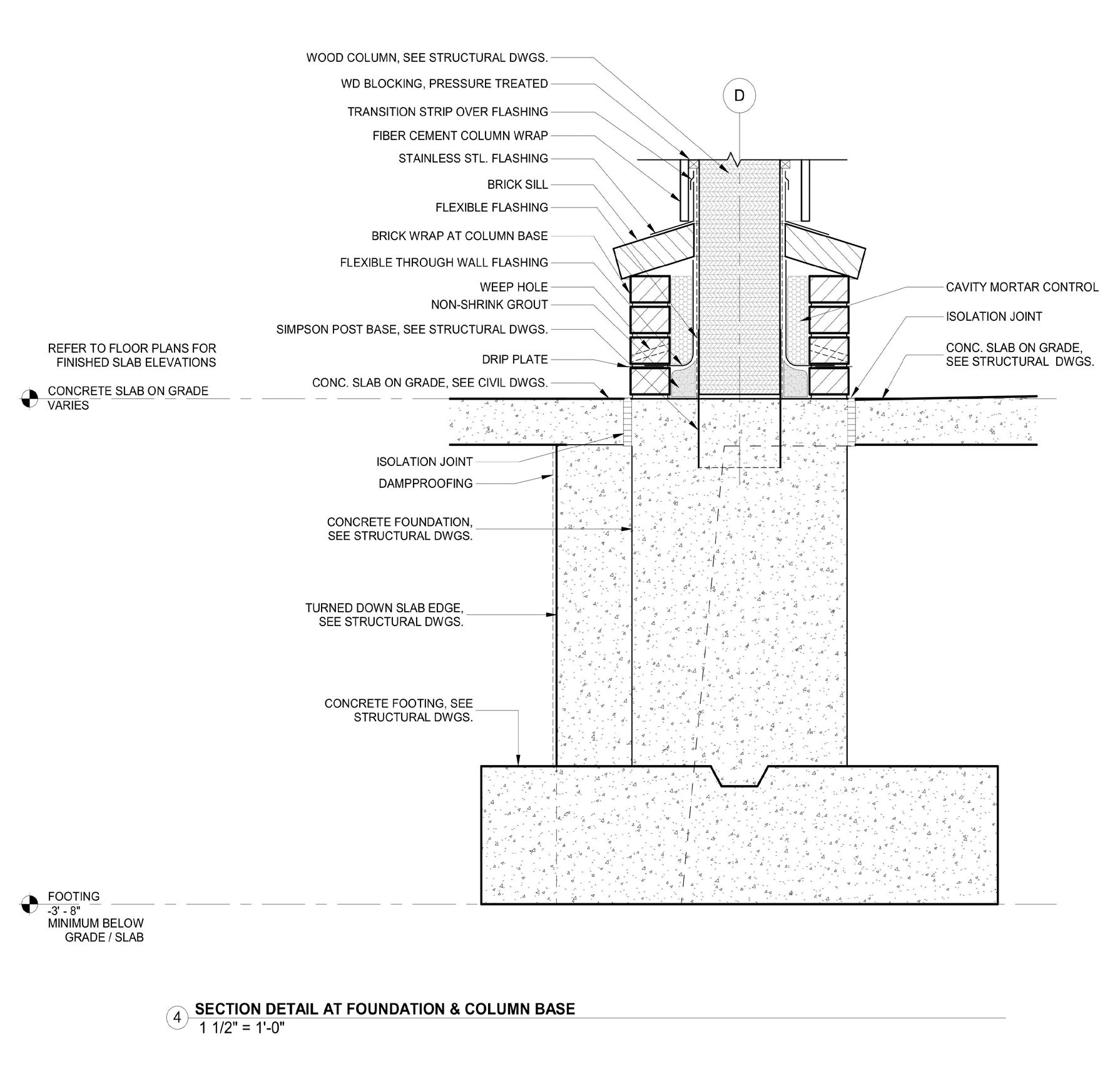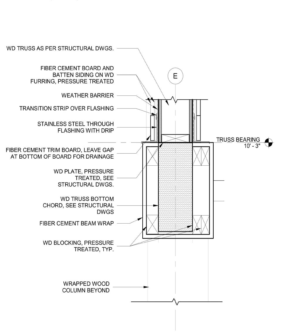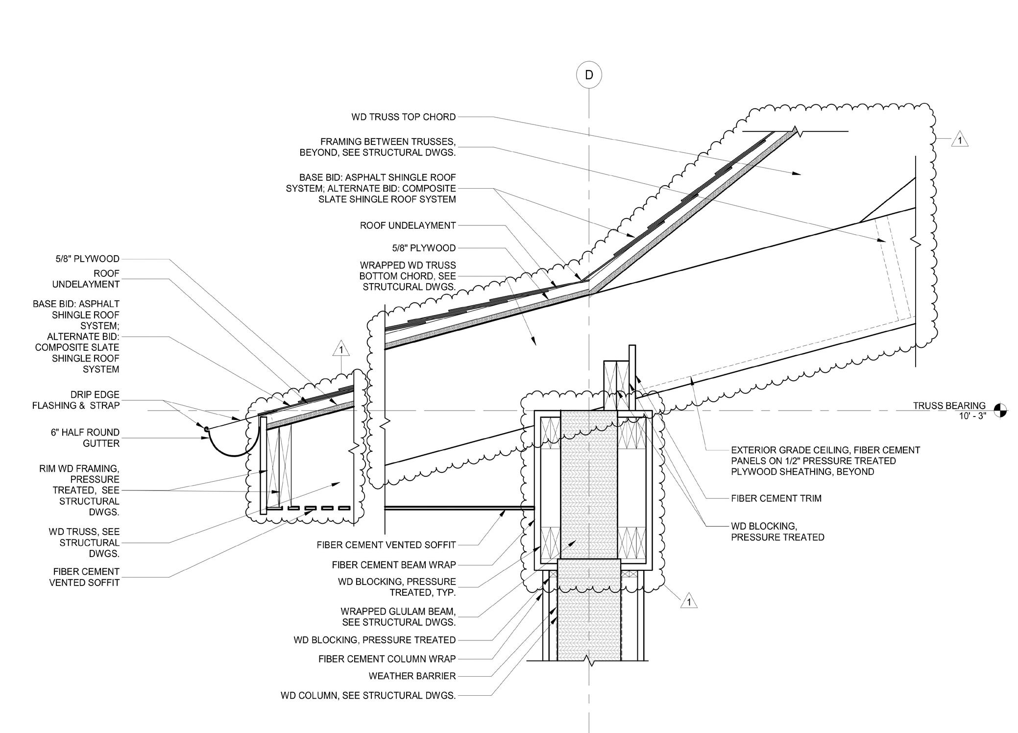 Structural system incorporates a combination of several wooden member types. Most of the beams and columns consist of engineered wood (1, 2, 4, 5, 6, 7, 8, 9); smaller span members consist of sistered dimensional lumber. Specialized wooden trusses are carefully detailed to confirmed with the roof shape, creating efficient & decorative design (2, 8, 9). Members are wrapped with fiber cement (this also assists balancing variation between different member dimensions; 5, 7). Enclosure walls consist of composite masonry walls, with the interior structural wythe comprised of Ground Face Polished Concrete Masonry Units (3). Above these, gable end walls consist of light wood frame (1, 5, 6). Column bases (2,4) are detailed based on local designs with speciality bricks, into which the wood columns are anchored. Foundation system consists of shallow foundations - poured concrete for the columns foundations and CMU for the enclosure walls foundations (2,3,4).