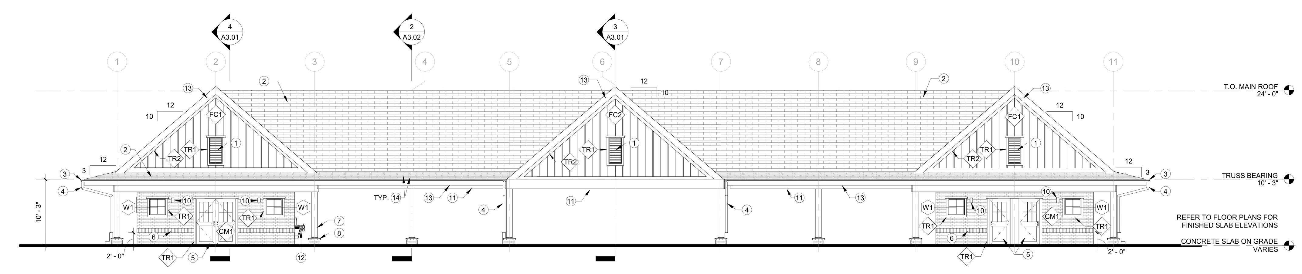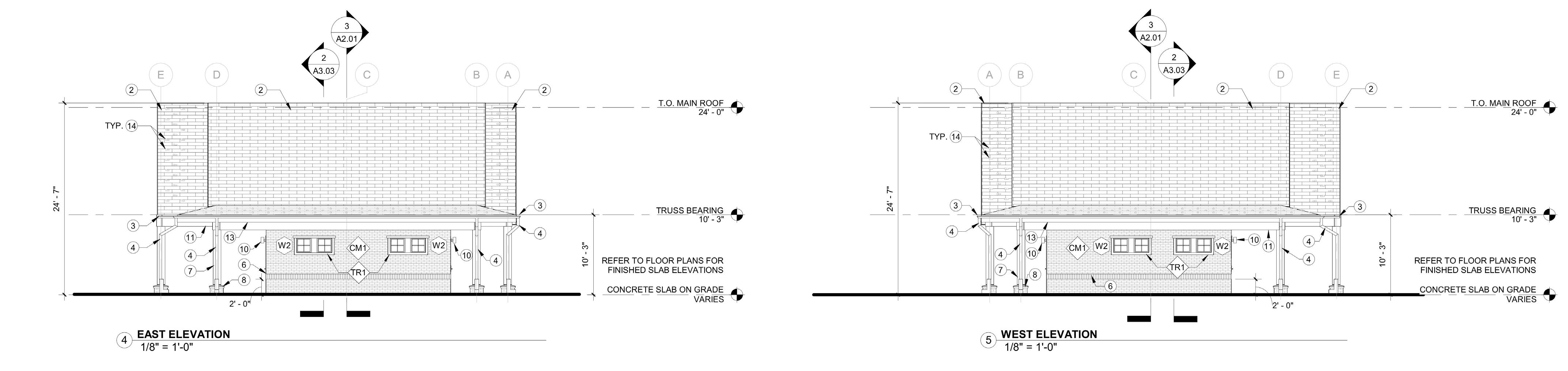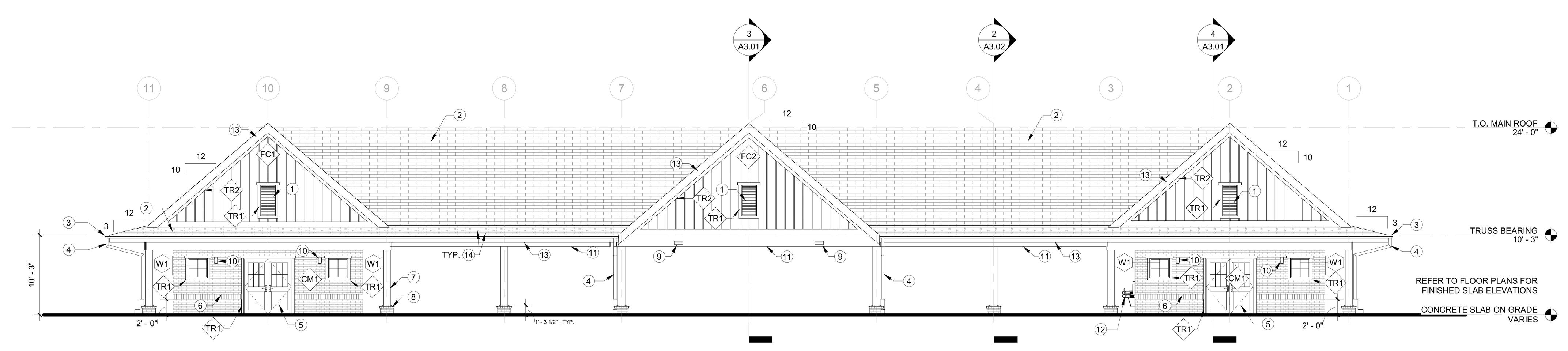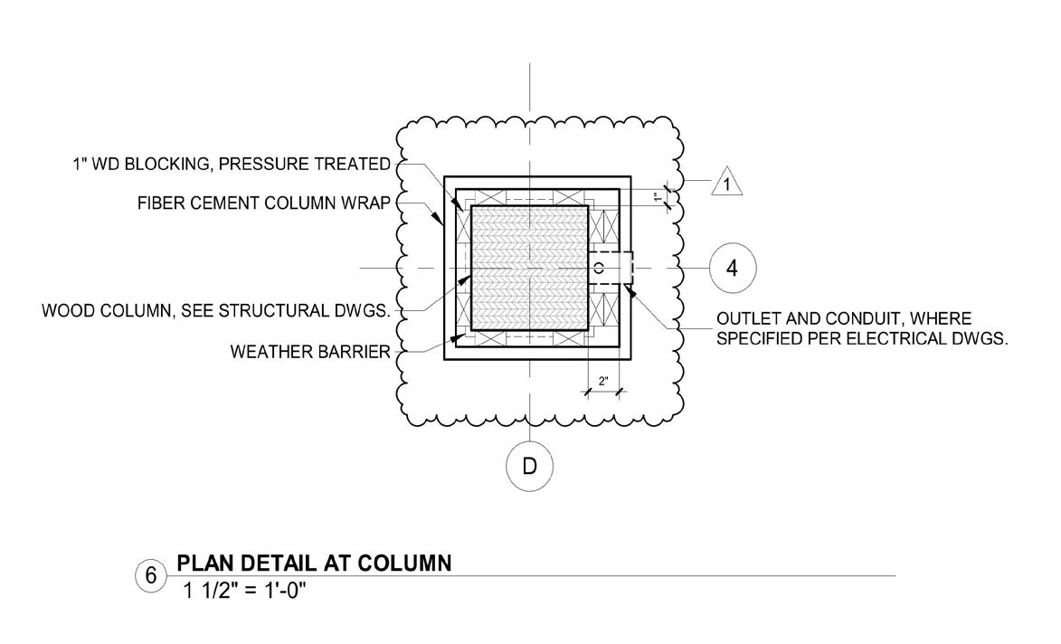 Structural system incorporates a combination of several wooden member types. Most of the beams and columns consist of engineered wood (1, 2, 4, 5, 6, 7, 8, 9); smaller span members consist of sistered dimensional lumber. Specialized wooden trusses are carefully detailed to confirmed with the roof shape, creating efficient & decorative design (2, 8, 9). Members are wrapped with fiber cement (this also assists balancing variation between different member dimensions; 5, 7). Enclosure walls consist of composite masonry walls, with the interior structural wythe comprised of Ground Face Polished Concrete Masonry Units (3). Above these, gable end walls consist of light wood frame (1, 5, 6). Column bases (2,4) are detailed based on local designs with speciality bricks, into which the wood columns are anchored. Foundation system consists of shallow foundations - poured concrete for the columns foundations and CMU for the enclosure walls foundations (2,3,4).