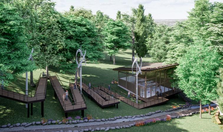 The Explorer lab is located in a more distance part of the site and is accessed by trail & ramp. The accessible ramp turns into a teaching tool thanks to 3 winds turbines that are attached to it.