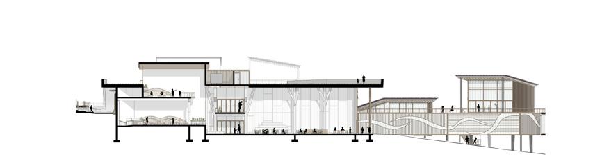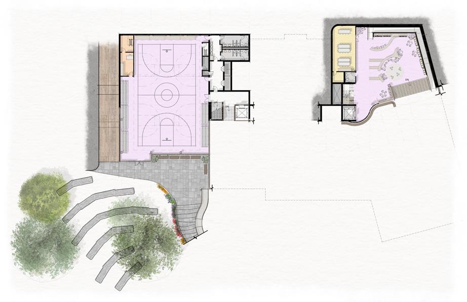 These partly subterranean spaces are tucked in the rear of the core building. They are accessible from the upper level through dedicated staircases & elevators, or through the large central sitting stair. The gym houses a large basketball court, while the library conveys a semi-submerged / burrow-like atmosphere, with soft seating options and a specialized attached lab.
