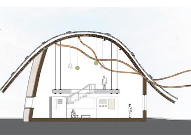 To embed the building within the ground, excavated earth is used to create an intensive green roof, with its ‘tail edges’ merging into the terrain.