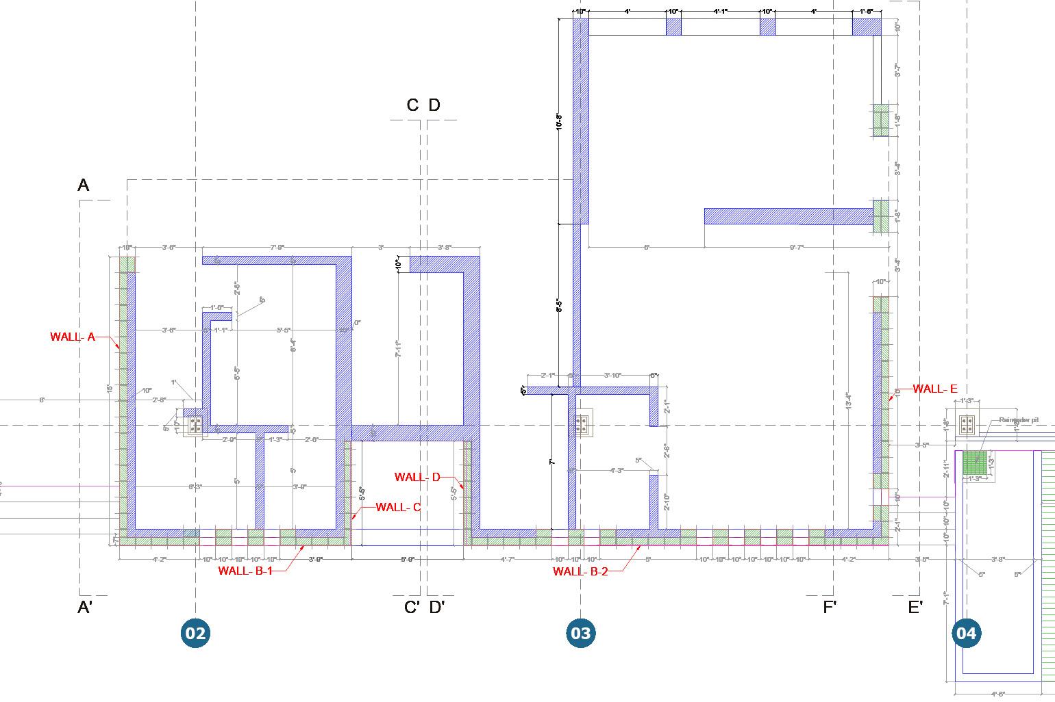 +3'-0" 17'-2" 3'-0 1 2 10'-6 1 2 2'-11 1 2 3'-0 1 2 10'-6 1 2 2'-11 1 2 12'-11 2 111'-3 2 12'-11 2 12'-8 2 111'-3 2 13'-2 2 9'-5" 4'-4" 4' 4'-3" 4'-212 SOCKET 4 SOCKET 4 SOCKET 4 SOCKET SOCKET 4 SOCKET SOCKET SOCKET 5'-3" 5'-11" 5'-4" 6' 5'-11" 5'-3" 16'-6" 10 SOCKET 9 1 2 sink line normal) purifier line 2- network 2- network +3'-6" A-02 Showroom with Restaurent, Gulshan 49, Dhaka 1213 CHECKED DRG.NO CONSULTANT: DRG. TITLE PREPARED BY CLIENT: PROJECT 26 11 2016 Architects MGH Group ISSUED FOR CONSTRUCTION A S M Forhad Hossain FOUNDATION, COLUMN & GRADE BEAM LAYOUT DATE ENGINEER: ARCHITECTS: 02. AR. Muhammad Abu Zobayer Riyal 01. AR. A M Forhad Hossain Mohammad Anisur Rahman B.Sc Engr.(Civil), MIEB, DMINB/CE A.N.M KHALED B.Sc Engr.(Civil), MIEB, DMINB/CE U.G.R F-1 F-2 F-3 F-1 F-1 F-1 F-1 F-2 F-1 F-2 F-1 F-1 F-1 F-1 F-1 F-3 F-3 F-3 GB GB GB GB GB GB GB GB GB GB GB GB GB GB GB GB GB GB GB GB 04 07 C A 01 02 03 05 06 B 04 07 01 02 03 05 06 C A B 20' 20' 20' 20' 20' 20' 3'-6" 3'-6" 127' 3'-6" 20' 20' 20' 20' 20' 20' 3'-6" 127' BRICK FOUNDATION C-1 C-1 C-1 C-1 C-1 C-1 C-1 C-1 C-1 C-1 C-1 C-1 C-1 C-1 C-2 C-2 C-2 C-2
