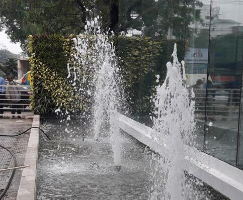 A green wall with a touch water pool and fountains are introduced with a signedge.Saved 8 exsiting big trees by design.
