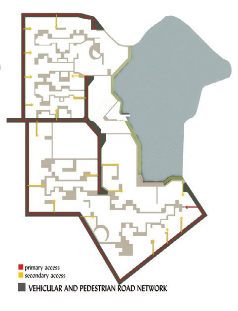 of land left soakable open green area and soft pave area for parking to penetrate rainwater. Vegetation on the lake side and near entry gate.