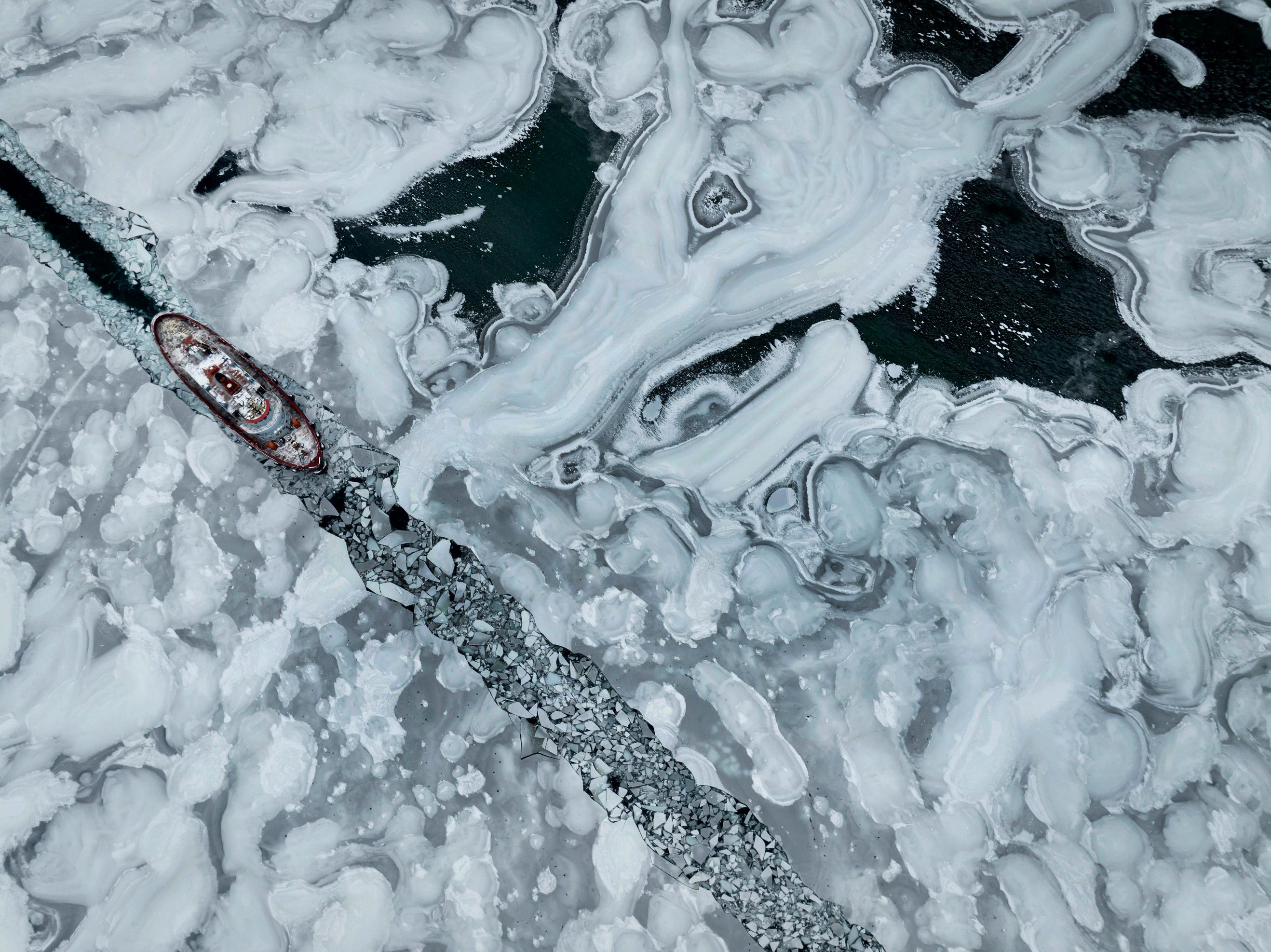 The icebreaking lake tug the Erika Kobasic breaks ice and makes its way from Lake Michigan to the bay of Sturgeon Bay, Wisconsin. The 110-foot tug was built in 1939 and started out in the US Coast Guard before being retired in 1982. The tug currently works out of Escanaba, Michigan often towing barges or breaking ice around the Bay of Green Bay. She is one of a handful of 110′ former USCG tugs in commercial service around the Great Lakes, and the oldest of that bunch.