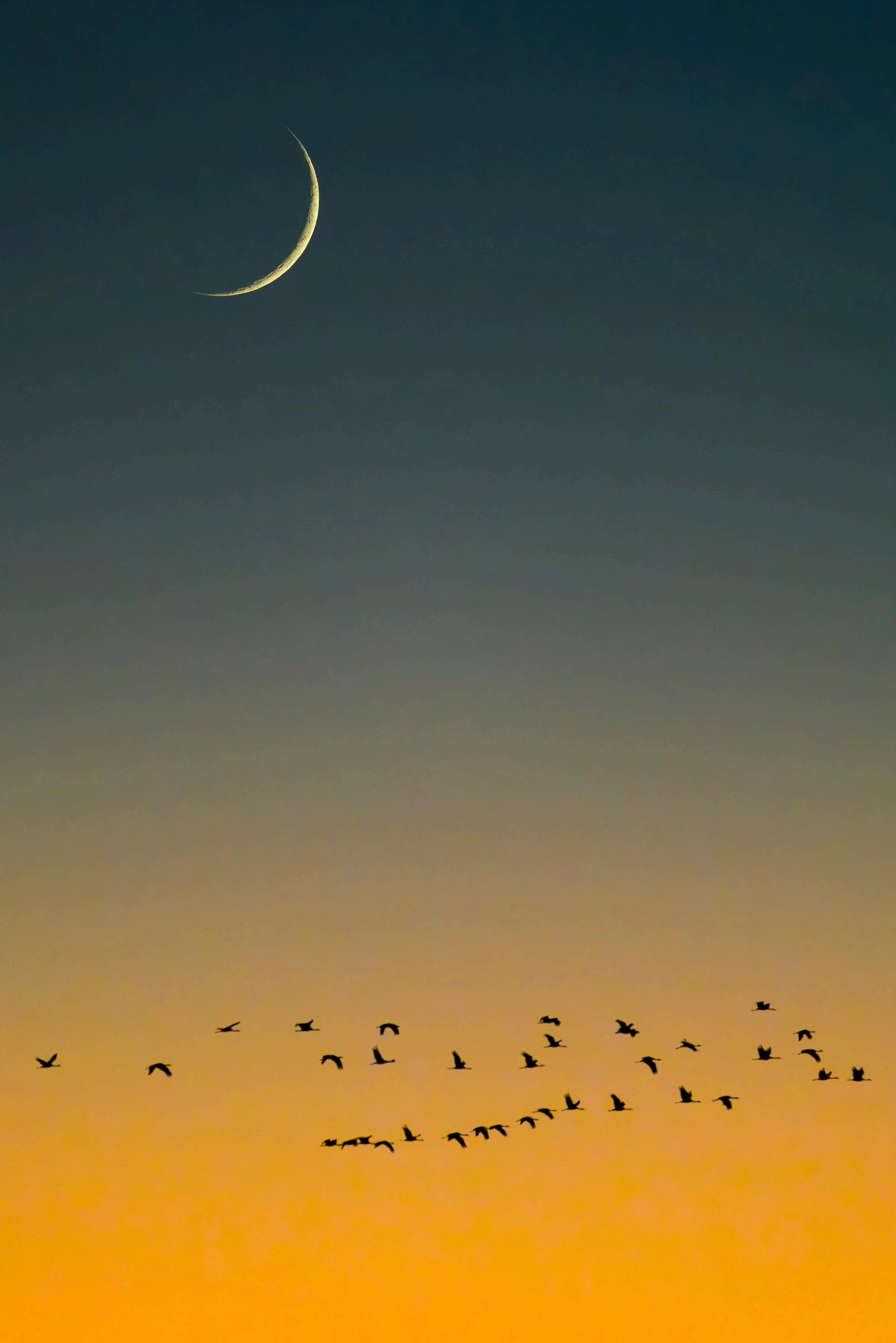 While I was watching Sandhill cranes coming in to roost, I saw the moon and a beautiful background. I chose my composition and waited until a flock of Sandhill cranes passed by. I was lucky, since this was the only flock who flew through the frame.