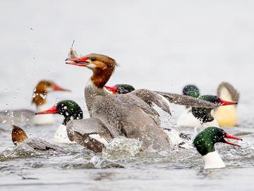 Los Angeles Arboretum, Arcadia, CA / Female Hooded Merganser With Crayfish - escaping from two males who were trying to take her catch away from her.