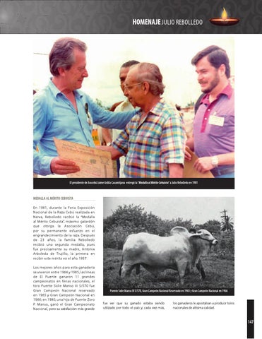 MEDALLA AL MÉRITO CEBUISTA En 1981, durante la Feria Exposición Nacional de la Raza Cebú realizada en Neiva, Rebolledo recibió la “Medalla al Mérito Cebuista”, máximo galardón que otorga la Asociación Cebú, por su permanente esfuerzo en el engrandecimiento de la raza. Después de 23 años, la familia Rebolledo recibió una segunda medalla, pues fue precisamente su madre, Antonia Arboleda de Trujillo, la primera en recibir este mérito en el año 1957. Los mejores años para esta ganadería se vivieron entre 1964 y 1985, las líneas de El Puente ganaron 11 grandes campeonatos en ferias nacionales, el toro Puente Solie Manso III S/570 fue Gran Campeón Nacional reservado en 1965 y Gran Campeón Nacional en 1966; en 1980, una hija de Puente Zoro P. Manso, ganó el Gran Campeonato Nacional, pero su satisfacción más grande