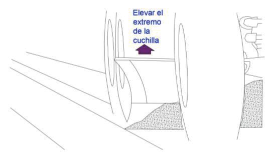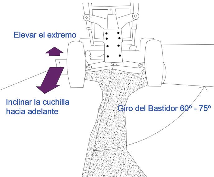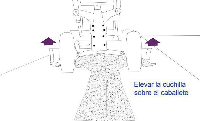 La cuchilla de la motoniveladora se posicionará en horizontal y se avanzará a una velocidad de primera marcha. Mientras la máquina se desplaza hacia adelante, se bajará la cuchilla entre 5 a 7 cm, dentro del suelo, dependiendo de las características del mismo, manteniéndola a nivel.