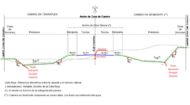 Previo al desarrollo de la temática que nos ocupa, se repasan a continuación las características geométricas que debería tener un camino rural. Cabe aclarar que las dimensiones de cada elemento constitutivo (ancho de obra básica, ancho de calzada y banquinas, taludes, etc.) dependerán de la jerarquía que posea dentro de su red cada tramo de camino.