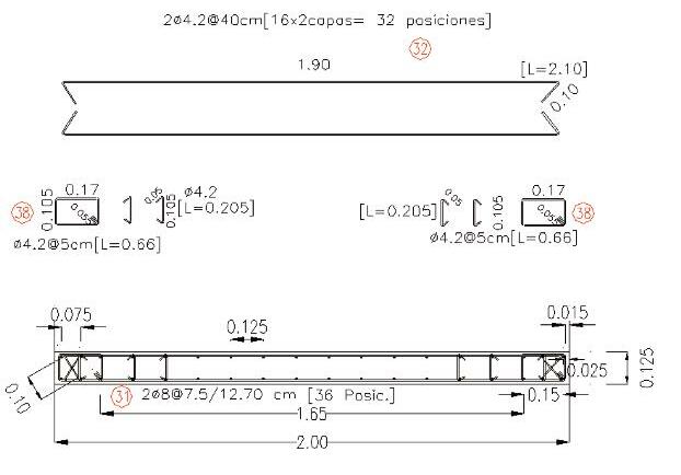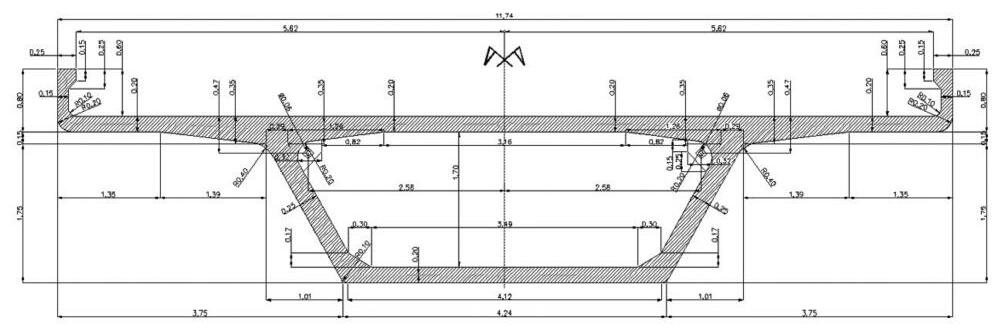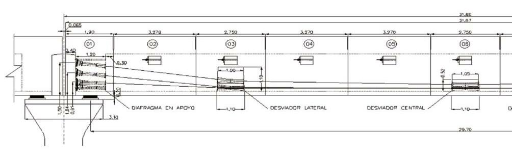 o Distancias entre ejes de pilas: 31 8 m / 28 6 m / 25 4 m o Luces entre ejes de apoyos: 29.7 m / 26.5 m / 23.3 m o Sección de la dovela: 4 89 m3 o Peso máx de las dovelas: ~40 t o Forma de tesado: postesado externo o Altura total de la viga (sin labios laterales): 2 10 m o Ancho superior: 11 75 m o Ancho inferior: 4 24 m o Relación máx. Luz / Altura de viga: 14.14 o Espesor de ala superior: 20 cm o Espesor de ala inferior: 20 cm o Espesor de almas: 25 cm o Inclinación de las almas: 60° o Radios de acuerdo en la unión ala sup – almas: 20 cm o Radio de acuerdo en la unión voladizo – almas: 40 cm o Relación luz voladizo / distancia entre ejes almas: 0.43 o Cantidad de desviadores: 3 o Cantidad de cables (según luz): 12 / 10 / 8 o Cantidad de cordones por cable: 19 x 0 62”