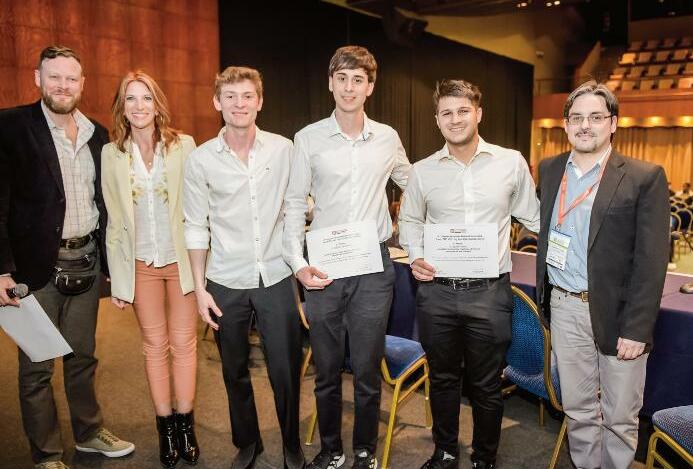 De Izq. a Der. Mg. Ing Aníbal Tolosa, Coordinador de la Comisión de Premios y Concursos de la AIE, Mg Ing Yolanda Galassi presidenta 27° JAIE, Santiago Rolando, Valentino Benedetich, Ag ustín Rafaelli ganadores del 2º puesto en el concurso, y el Ing Mariano Travaglia Vicepresidente de las 27°JAIE