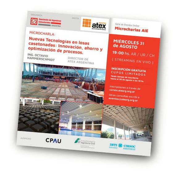 En este caso, la Asociación de Ingenieros Estruct les (AIE) junto a la empresa Atex Argentina, ofre ron la Microcharla “Nuevas Tecnologías en L Casetonadas: Innovación, ahorro y optimizació procesos”, presentada el pasado 31 de agosto a 19 00 horas, siendo su disertante el Ing Octavio H merschmidt Entre los temas analizados por el pr sional se listan: ¿Por qué las losas casetonadas vue a ser tendencia en nuevos proyectos?; Nuevas tec logías aplicadas a la fabricación de moldes recup bles: Variedad de tamaños, gran resistencia, perf terminación; Ventajas frente a metodologías tradi nales; Industrialización y mejoras de rendimiento obra; y Ahorros versus otros sistemas de losas ali nadas (postesado, esferas, poliestireno) y losas tr cionales (losas + viga, entrepisos sin viga)