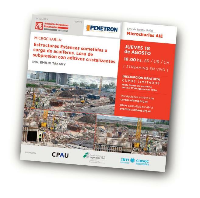 La Asociación de Ingenieros Estructurales (AIE) y la firma Penetron Argentina, realizaron la Microcharla “Estructuras Estancas Sometidas a Carga de Acuíferos: Losa de subpresión con aditivos cristalizante”, el pasado 18 de agosto a las 18 00 horas La misma fue dictada por el Ing Emilio Takagy En el evento, el citado especialista destacó la determina-