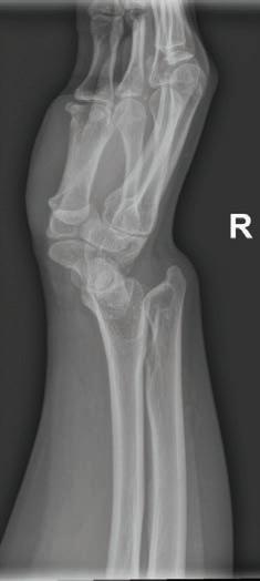 Se observa un arqueamiento de la diá sis radial con aumento del espacio interóseo a nivel de la articulación radioulnar distal. También se aprecia subluxación dorsal de la articulación radioulnar distal en la proyección lateral.