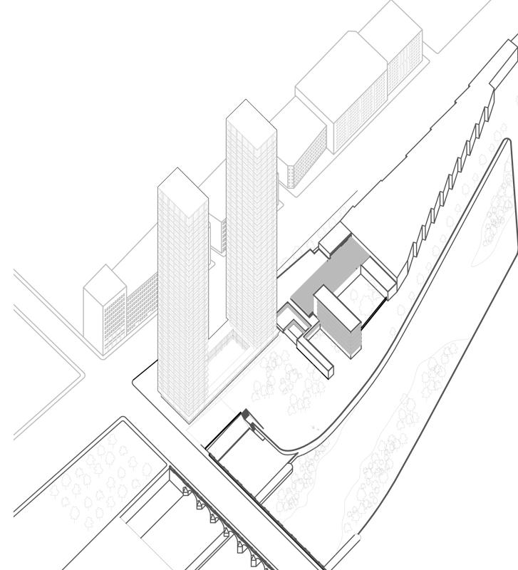 Un alzado articulado en tres diferentes partes sigue la composición tripartita característica del rascacielos neoyorquino, en el, se despliega el extenso programa; la base del edificio ocupa la mayor parte de la superficie construida, en las plantas subterráneas, se diseñan dos usos públicos, un espacio polivalente como sala de fiestas o auditorio, y el estacionamiento que nutre a los demás usos. A nivel de calle da entrada a dos cotas, que se retranquea para generar un extenso patio fortaleciendo la unión entre los volúmenes; el fuste, es el desarrollo vertical, contiene los usos de escala doméstica, vivienda, residencia de estudiantes y ancianos, donde se da especial importancia a las zonas comunes, como espacios para originar interacciones sociales; y la coronación, conformada por los espacios de triple altura ocupados, por areas deportivas de mayor escala.