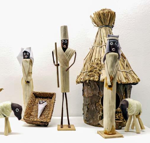 cerritos, establos, pesebres y cunas que reconstruyen la escena navideña original. En simetría con los adornos que se colocan en las calles, los naci mientos están rodeados de escarcha, estrellas, figuras angelicales, luces de colores, guirnaldas y figuras de barro.