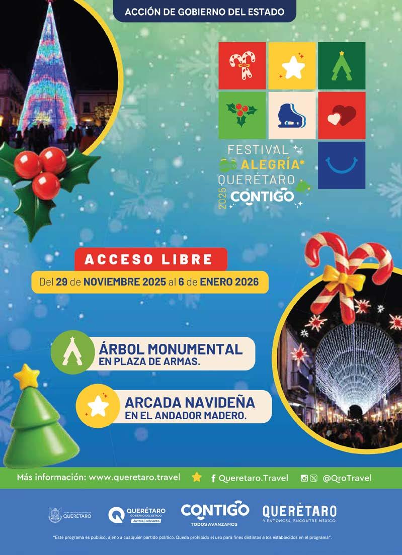 Publicación de contenido turístico y cultural del estado de Querétaro, revista mensual diciembre de 2025. Editor responsable ante la Secretaría de Turismo del Estado de Querétaro: Carlos de Jesús Ajís Castillo. Número de Certificado de Reserva otorgado por el Instituto Nacional de Derecho de Autor: 04-2023-091917100000-102. Número de Certificado de Licitud de Título y Contenido: 17623. Domicilio de la Publicación: Paseo de las Artes 1531-B, Col. Josefa Vergara C.P. 76090, Santiago de Querétaro, Querétaro, México. Imprenta: Talleres Gráficos del Poder Ejecutivo del Estado de Querétaro, Francisco I. Madero 68, Centro C.P.76000, Santiago de Querétaro, Querétaro, México. Distribuidor: RIO HILL CO., Virtudes 23, Col. Misión Mariana C.P.76903, Corregidora, Querétaro, México.